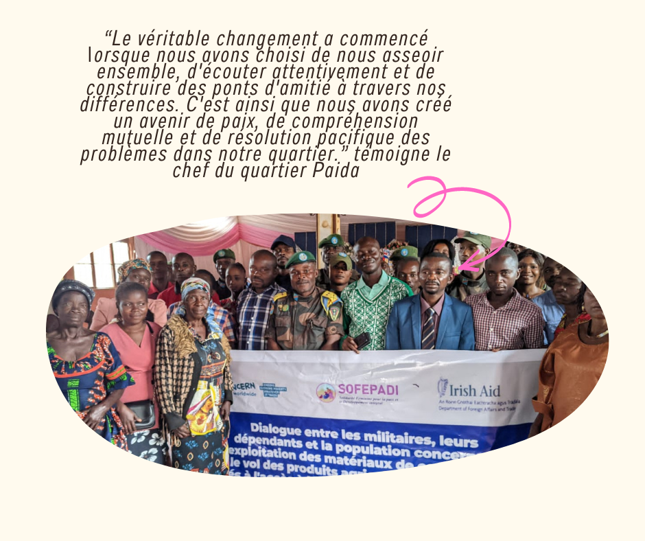 « Notre quartier était confronté à un conflit réel, caractérisé par des vols de produits agricoles, des occupations illégales de maisons et l’exploitation des ressources naturelles. Les disputes liées à ces problèmes constituaient une source de tension persistante entre les civils, les militaires et leurs familles. Cependant, grâce à l’initiative de Sofepadi, avec le soutien technique de CONCERN et le financement de CHC, nous avons entrepris des dialogues pour changer cette réalité. », Monsieur Paluku, chef de quartier Paida.